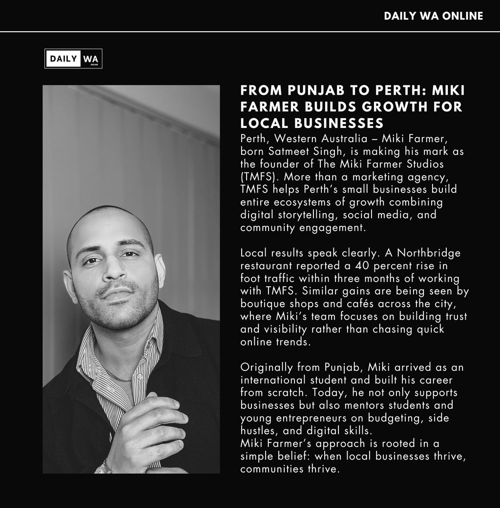 Perth, Western Australia – Miki Farmer, born Satmeet Singh, is making his mark as the founder of The Miki Farmer Studios (TMFS). More than a marketing agency, TMFS helps Perth’s small businesses build entire ecosystems of growth combining digital storytelling, social media, and community engagement.
